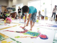 大きな紙のうえに好きな姿勢で寝転がって、からだのカタチをとります。そこに絵の具で自由に絵を描いて、完成したら、カタチにそって切り取ります。それを壁にかざって完成です。みんなで思いっきり描きましょう! |