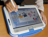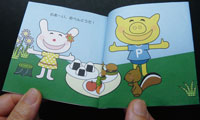 パソコンの画面上でたべものやどうぶつの絵をならべておはなしづくりをします。出来た作品は印刷してミニ絵本になってお持ち帰りできます。 |